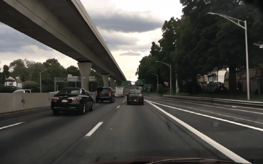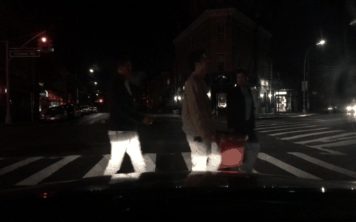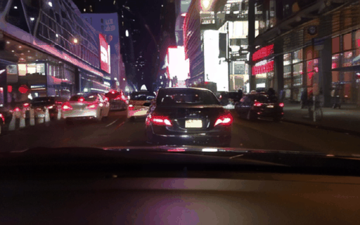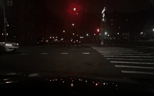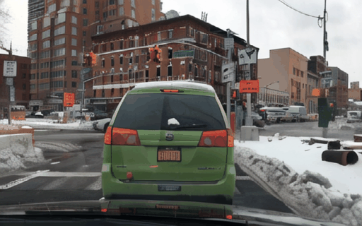 Our model has not been trained on car crash examples. To evaluate its generative capabilities on out-of-distribution scenarios, we tested it using manually crafted car crash prompts. In this scenario, the ego car (represented as a green car in the bird's-eye view map) remains stationary. Two new agents (red) were positioned to cross the intersection from opposite directions, leading to collision between them. These agents' bounding boxes are then projected onto the ego car's perspective. The resulting bounding-box frames are used as input for the Box2Video network, which generates realistic video sequences. Upon collision, the two cars merge into one in the output video, illustrating the model's response to an out-of-distribution input.